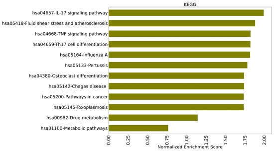 Top 12 pathways associated with carnosol targets according to the KEGG pathways database. The normalized enrichment score showed the enrichment degree in KEGG.