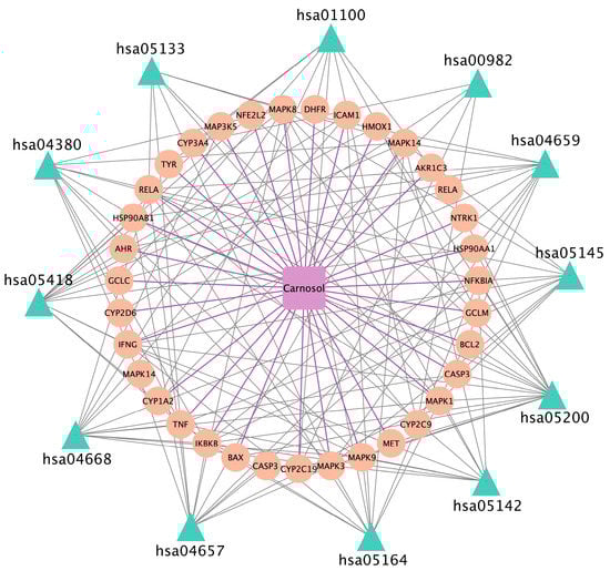 The target–pathway network is constructed to elucidate the interactions among carnosol, targets and pathways. The target–pathway network associated with carnosol (Figure 6) shows 48 nodes and 159 edges. Orange circles correspond to targets, and green triangles represent pathways.