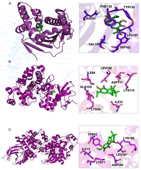 The residues on the binding site of proteins interacting with carnosol were identified using Protein–Ligand Interaction Profiler (PLIP) https://plip-tool.biotec.tu-dresden.de/plip-web/plip/index (accessed on 2 February 2023) []. For that purpose, the complexes were converted to pdb format to obtain pharmacophores that indicated the type and quantity of interactions formed in the protein–ligand interphase. The 3D structures of these complexes were visualized using the PyMOL version 1.4 [].
