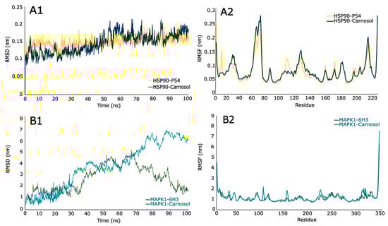 The MD simulations of carnosol complexed with HSP90 and MAPK1 were investigated during a simulation time of 100 ns to analyze the flexibility and stability of the complex over time. The stability of HSP90 and MAPK1 proteins with their respective co-crystallized ligands was also simulated under the same conditions in order to compare the existing conformational and energetic changes through calculations of RMSD, RMSF, and MMGBSA (Figure 8).