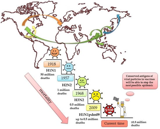 The epidemiological picture of influenza is based on many factors such as changes in the nature of the antigenic properties of the virus, the transmissibility of the virus, and the susceptibility of the population [8]. In fact, everyone has had the flu at least once in their life. It is worth clarifying that there are pediatric populations that do not have influenza until they are naturally exposed, and some vaccinated individuals do not have a true flu infection until the vaccine fails to protect them against the current circulating strain. The first mention of the alleged influenza syndrome was noted as early as 412 BC in the writings of Hippocrates [9]. For many centuries, there have been global outbreaks of influenza epidemics, most notably in 1510 and 1580 [10], 1688 [11], and 1693 [12]. Three influenza virus pandemics of the 20th century have affected the entire globe: 1918-19 (‘Spanish’ flu H1N1)—50 million deaths [13,14,15,16], 1957 (‘Asian’ flu, H2N2)—1 million victims [1,17], 1968 (‘Hong Kong’ flu, H3N2)—0.5 million deaths in total [18,19,20], 2009 H1N1pdm09 > 280,000 deaths [21]. Few diseases can match the flu in terms of contagiousness and number of deaths per year.