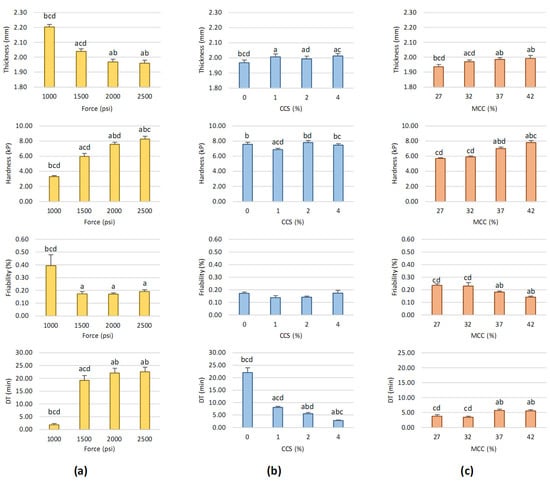 | Force (psi) | CCS (%) | MCC (%) | Friability | DT | |||||