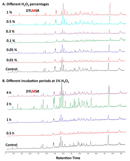 The next question was whether there was a correlation between the oxidation level and exposure time at a certain amount of H2O2. For this aim, the samples were incubated in 0.1% H2O2 for 0.5, 1, 2, and 4 h at room temperature. Briefly, 0.1% H2O2 was chosen since it sufficiently oxidised methionine on DTLMISR at a measurable level. The TIC of samples exposed to different incubation times in 0.1% H2O2 showed similar profiles, except for the 1 h incubation period, which was insufficient to observe a detectable oxidation signal (Figure 1B).
