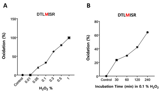 On the other hand, 20% of the DTLMSIR peptides were Met-oxidised in the 0.05% H2O2 group, and the oxidation rate reached 99% at the maximum H2O2 concentration (Figure 2A). Approximately 23% of DTLMSIR peptide oxidation was observed in 0.5 h incubation, while it was 32% at 1 h, 42% at 2 h, and 64% at 4 h (Figure 2B). Interestingly, the oxidation at longer incubation time was observed only on the DTLMISR peptide and not on other methionine or tryptophane residues.