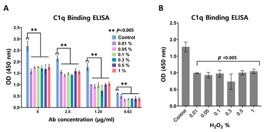 C1q ELISA binding analysis of the mAbs exposed to different H2O2 percentages. (A) The results of C1q ELISA binding of anti-VEGF IgG molecules exposed to oxidative stress at different Ab concentrations. (B) The results of C1q ELISA binding of oxidative-stress-exposed anti-VEGF IgG at 1.25 µg/mL Ab concentration. The data are represented as the mean of at least three independent measurements. For statistical analysis, a one-way ANOVA test was applied.