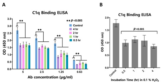 When samples incubated with 0.1% H2O2 at room temperature for specific incubation times were examined, it was observed that the amount of C1q binding decreased with decreasing antibody concentrations (Figure 4A). Furthermore, even half an hour of exposure to oxidative stress caused a significant decrease in the C1q binding affinity of the antibodies when compared with that of the control group. However, when the effects of exposure times were compared at a constant sample concentration, no direct relationship could be identified under the tested experimental conditions (Figure 4B).