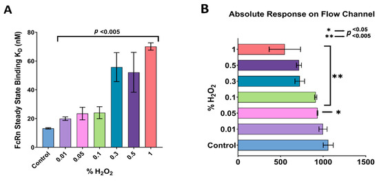 The S.P.R. method was used to determine the binding affinity of FcRn molecules and the anti-VEGF IgG molecules exposed to varying oxidative stress conditions. KD values calculated using a steady-state affinity model are presented in Figure 5A. The KD value increased as the percentage of H2O2 increased. Therefore, the binding affinity of FcRn showed a statistically significant decrease with increased exposure to oxidative stress. The control anti-VEGF IgG sample (not exposed to stress) had the lowest and the best KD value, calculated as 13.15 ± 0.36 nM, indicating the disruptive effect of oxidative stress on the anti-VEGF IgG molecule's function. In addition to these results, the absolute binding response values of the samples were determined in the flow channel. When the absolute response values were examined at different amounts of H2O2 exposure, the control sample had the highest binding activity (Figure 5B), indicating an exceedingly high number of molecules bound on the chip surface due to high FcRn interaction. The absolute response rate decreased with the increase in oxidative stress exposure; therefore, the FcRn binding affinity also decreased.