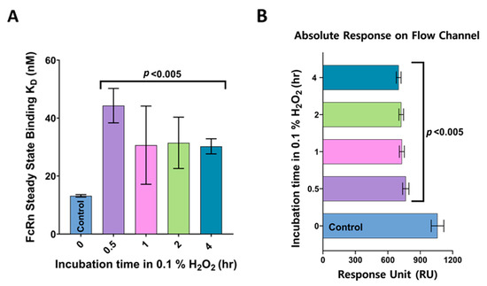 Using the same steady-state binding model, the FcRn binding affinity of antibodies incubated in 0.1% H2O2 was separately investigated. The control sample showed the highest binding affinity with the lowest KD value, determined as 13.15 ± 0.36 mM (Figure 6A). The FcRn binding affinities of the oxidised samples showed a statistically significant decrease compared with the control sample's. Comparable results were obtained when the samples were exposed to a fixed oxidative stress level at varying exposure times. The absolute responses of the samples exposed to oxidative stress decreased as the exposure time increased compared with that of the control sample (Figure 6B), leading to a reduced FcRn binding affinity. As a result, the absolute response confirmed our results in the steady-state binding model.