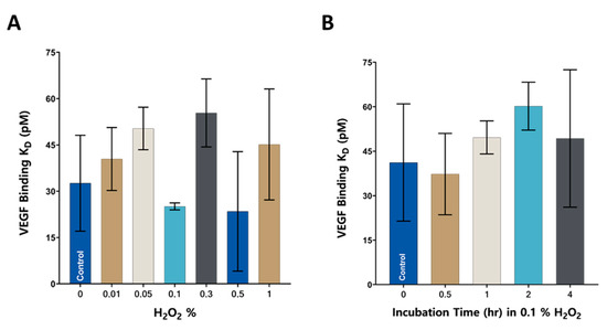 In this study, the SPR method was used to determine the affinity of VEGF towards the anti-VEGF-IgG molecules exposed to various oxidative stress conditions. First, VEGF binding analyses of antibodies exposed to different H2O2 percentages were performed (Figure 7A). The KD value of the control sample, which was not exposed to any oxidative stress condition, was determined as 32.60 ± 12.69 pM. There was no statistically significant increase or decrease in the exposed samples' binding affinities compared to that of the control sample; thus, the interaction of the mAbs with the target molecule was not impaired in our studies. The binding affinities of antibodies incubated in 0.1% H2O2 at different time intervals were also evaluated (Figure 7B). The KD value of the control sample was determined as 41.2 ± 17.2 pM. Similar to the trend we observed with antibodies exposed to different percentages of H2O2, the binding affinity of antibodies exposed to oxidative stress for different time intervals did not show any statistically significant change compared to the control sample.