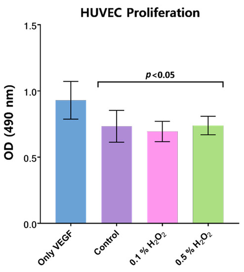 As presented in Figure 8, the negative control sample gave a low absorbance value, indicating inhibited cell proliferation. The treatment with antibodies exposed to 0.1% and 0.5% H2O2 reduced the optical density of HUVECs as much as the negative control sample. In other words, increased oxidative stress levels did not cause a statistically significant change in cell proliferation rates under these experimental conditions, indicating that the stressed anti-VEGF molecules continued to bind and neutralise VEGF molecules, which agrees with the existing literature [58].