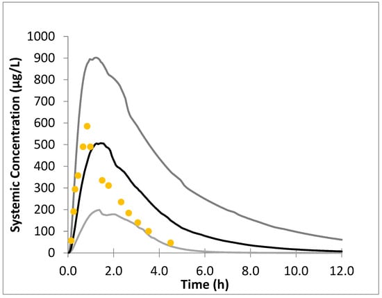 Simulated plasma concentration–time profile following oral administration of 400 mg sofosbuvir in healthy adult population. The gray lines correspond to the 95% and 5% margins of the data, the black line is the mean simulated data, and the yellow dots represent the observed adult data [21].