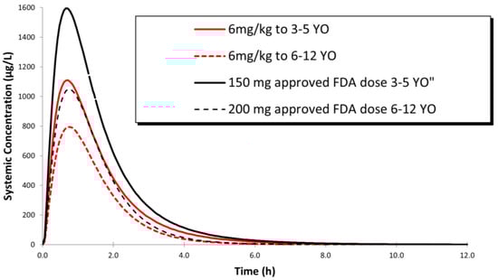 The studied pediatric groups were divided into two age ranges: 3–5 y/o and 6–12 y/o. Using an age group of 3–5 rather than 3–6 y/o was due to the age setup in Simcyp® that does not allow for age overlap.