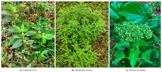 Medicinal plants contain a wide variety of secondary metabolites, such as alkaloids, phenolic compounds, terpenoids, and sulfur-containing compounds, which have been found to have different pharmacological activities. Historically, bioactive compounds of plants have played a key role in drug discovery, especially for cancer and infectious diseases [3]. COVID-19 had a positive impact on herbal medicine studies. Recently, there has been an increase in the search for plant-based drugs and nutritional supplements. The number of publications on bioactive natural product studies has increased more than 3-fold during the past ten years, according to a recent search using the keywords, “Natural Product Research” in the ScienceDirect database. Thus, this paper reviews the plants grown in Guam used in traditional remedies for urinary tract problems and their reported pharmacological properties. The selected medicinal plants are Euphorbia hirta, Phyllanthus amarus, Premna serratifolia, Psidium guajava, and Urena lobata (Figure 1).