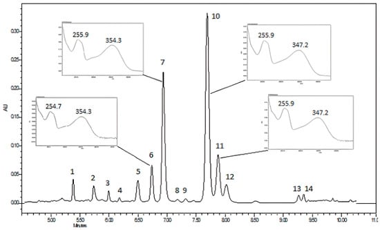 In the UPLC chromatographic analysis, a good resolution of the peaks was achieved, based on a modification of the methodology proposed by Nascimento and co-workers [3]. In this chromatogram obtained from the crude extract, measured at 254 nm, 14 peaks corresponding to different compounds are observed, with peaks 7 and 10 being the major compounds, with retention times of 6.9 and 7.7 min, respectively (Figure 1). All the compounds were identified as flavonoids except peak 2, through their characteristic UV spectra for flavonoids and phenolic acids [15,47].