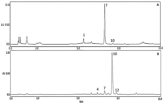 UPLC-PDA chromatogram at 254 nm. (A) Chromatogram of fraction 13 obtained by CPC; (B) chromatogram of fraction 16 obtained by CPC.