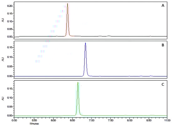 UPLC-PDA chromatogram of the standard rutin 50 μg mL−1 at 254 nm for robustness assay. (A) Increase in the pH of the mobile phase; formic acid 0.5%. (B) Decrease in column temperature: 25 °C. (C) Decreased flow rate: 0.3 mL min−1.