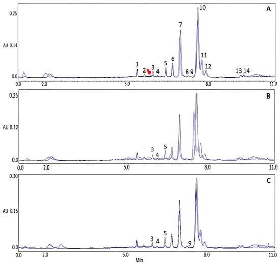 UPLC-PDA chromatograms for crude extract at 254 nm for stability under stress assay. (A) Degraded extract under neutral hydrolysis by reflux for 24 h (Blue); crude total extract chromatogram (Black). (B) Degraded extract under basic hydrolysis 0.01 N NaOH at 40 °C/8 h (Blue); crude total extract chromatogram (Black). (C) Degraded extract under acid hydrolysis at 40 °C/8 h (Blue); crude total extract chromatogram (Black).