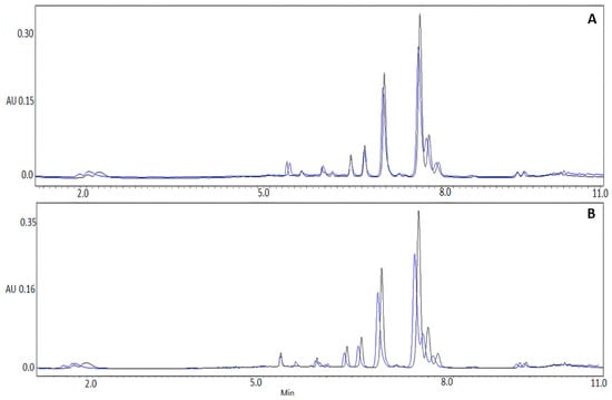 UPLC-PDA chromatograms for crude extract at 254 nm for stability under refrigeration assay. (A) Degraded dry extract under refrigeration at 4 °C/22 days (Blue); Crude total extract chromatogram (Black). (B) Degraded aqueous solution extract under refrigeration at 4 °C/22 days (Blue); Crude total extract chromatogram (Black).