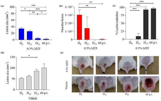 Monitoring lesion size and parasite loads in BALB/c mice infected with L. amazonensis, following topical MTF (0.5% MTF hydrogel) treatment at 0, 12, 25, and 60 days post treatment (p.t.). The figures show the drug effect on lesion size (a) and parasite loads (b), the % of lesion reduction induced by MTF (c), the effect of the vehicle treatment on lesion size (d), and the lesion images after MTF and vehicle treatment (e). The mean ± S.E.M. of lesion sizes after 0.5% MTF (n = 6) and vehicle (n = 4) and of the parasite load after 0.5% MTF (n = 3). Bars represent the standard error Turkey Multiple Comparison Test between different treatment days and p.t. * Significant differences p < 0.05, ** p < 0.01 ***, p < 0.005. D0: day 0; D12: day 12; D25: day 25; p.t.: 60 days post treatment.