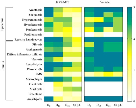 Skin samples were collected from mice treated with 0.5% MTF hydrogel at different time points (0, 12, 25, and 60 days p.t.) with a sample size of 6 per time point. For the vehicle group, samples were collected from 4 mice on day zero and 2 mice each on days 12, 25, and 60. (Supplementary Table S2). Biopsies were fixed in 10% neutral formalin for 24 h, embedded in paraffin, and sectioned into 5 µm thick sections using a microtome. Dewaxed slices were stained with H & E and examined using microscopy. The epidermis was analysed for acanthosis, spongiosis, hypergranulosis, hyperkeratosis, parakeratosis, papillomatosis, and reactive keratinocytes. The dermis was examined for fibrosis, angiogenesis, inflammatory infiltrate, lymphocytes, plasma cells, polymorphonuclear cells, macrophages, eosinophils, giant cells, mast cells, granulomas, and amastigotes. The results were expressed in a categorical qualitative scale with crosses, as follows: (−) absence, (+) mild, (++) moderate, and (+++) severe [27].