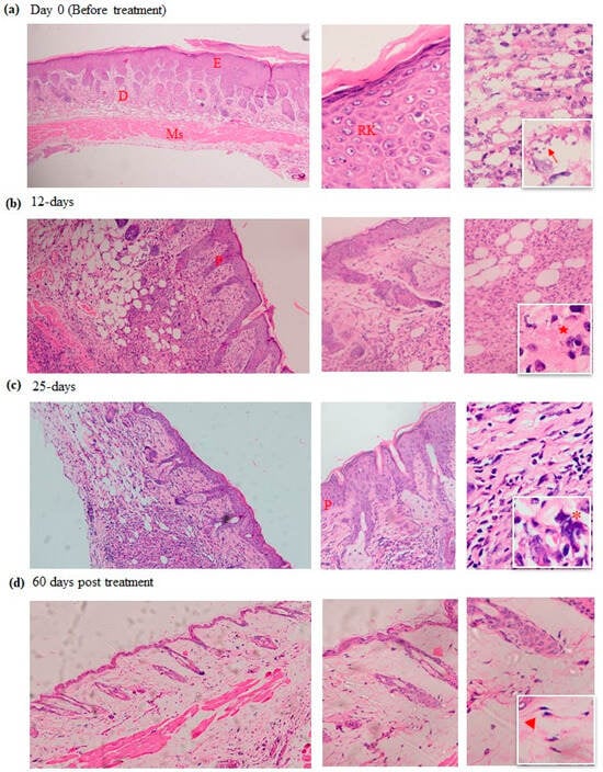 Histological study of cutaneous leishmaniasis skin sections taken before and at different time points during and after MTF treatment. The skin samples were stained with H&E, including samples taken at day 0 or before treatment (a), 12 days (b), 25 days (c), and 60 days after treatment with MTF hydrogel (d). Microphotographs were taken at different magnifications, including ×200, ×400, and ×1000. The third column highlights the presence of amastigotes (arrow), granuloma (star), mast cells (asterisk) and fibroblast cells (arrowhead). E, epidermis; D, dermis; Ms, muscle; RK, reactive keratinocytes; P, papillomatosis.