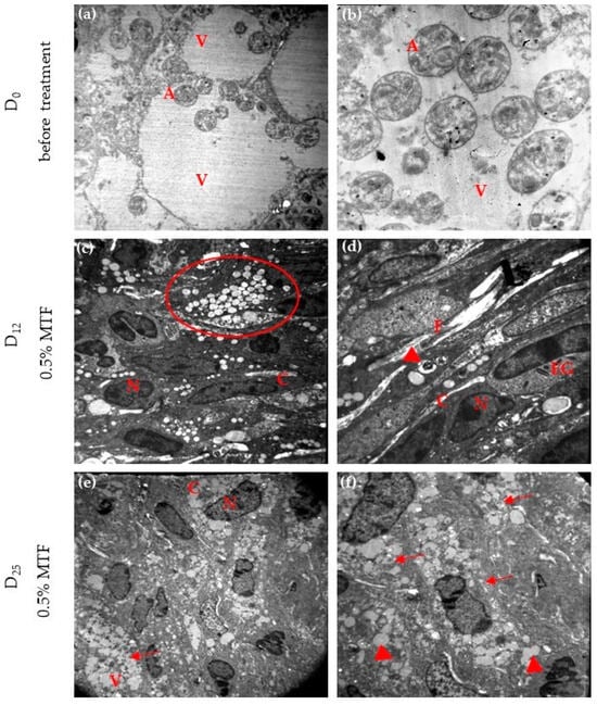 On day 0, the macrophages showed different sizes of parasitophorous vacuoles containing numerous well-preserved amastigotes free or attached to the vacuole membrane. The amastigotes appeared with nuclear chromatin distributed normally, intact mitochondrial membranes, cell membranes, and kinetoplasts (Figure 4a,b). No parasites were observed outside of the vacuole. After 12 days of 0.5% MTF-hydrogel, conserved macrophages exhibited multiple cytoplasmatic vacuoles without amastigotes in the fields examined. Most of these vacuoles contained electron-dense lipid-like material, while others held residual parasite structures. In addition, fibroblasts, collagen fibres, and eosinophils were observed (Figure 4c,d). After completing 25 doses of the treatment, the cells displayed numerous vacuoles in their cytoplasm. Some of these vacuoles contained highly particulate electron-dense material, while others held a smaller amount of homogeneous electron-dense material. No amastigotes were detected in the sample, as seen in Figure 4e,f.