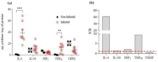 After 4 to 6 weeks of infection, areas of CL lesions displayed an average size of 40 mm2. Lesion lysates exhibited levels of IL-4, IFNγ, IL-10, TNFα, and VEGF of 38.71 ± 6.2, 12.55 ± 3.1, 11.52 ± 2.3, 4.35 ± 0.5, and 9.28 ± 2.3 pg/mg protein, respectively. The levels of IL-4, IFNγ, IL-10, TNFα, and VEGF of non-infected skin (healthy skin) showed levels of 0.63 ± 0.3, 5.93 ± 1.1, 8.38 ± 1.6, 0.46 ± 0.26, and 20.56 ± 1.9 pg/mg protein, respectively (Figure 5a). The IL-4 and TNFα levels were significantly higher in CL lesions than in non-infected skin (p < 0.001), with ICR values of 61.4 and 9.5, respectively. IFNγ levels were slightly higher (ICR 2.1); IL-10 showed a similar level, with an ICR value of 1.4, while VEGF was found to be downregulated in cutaneous lesions, with an ICR value of 0.45 (Figure 5b). In similar experimental models, i.e., for L. major infection, BALB/c mice are susceptible and produce high levels of IL-4 and IL-10 (Th2 response), while C57BL/6 mice are resistant, and produce high levels of IFNγ but no IL-4 and IL-10 (Th2 response) [6]. For L. amazonensis infection, as with other NW-Leishmania species, both strains of mice are susceptible, and the Th1/Th2 dichotomy is not always observed. In a study on C57BL/6 mice, it was found that chronic ulcerative lesions were linked to high levels of proinflammatory cytokines mRNA, such as IL-12, TNFα, and IFNγ, as well as iNOS during the late phase of infection [45]. In our research, we observed an increase in TNFα levels (ICR 9.5), increased levels of IFNγ (ICR 2.1), no change in IL-10 levels, and, like L. major infection in susceptible BALB/c, a rise in IL-4 (ICR 62.4).