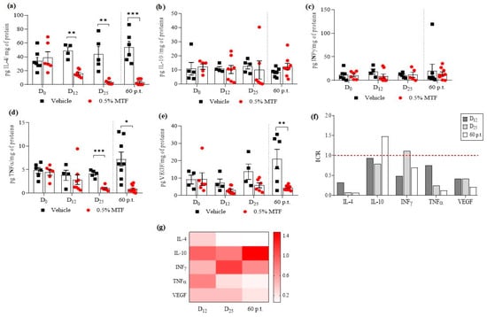 Monitoring cytokines released after 0.5% MTF and vehicle topical treatment at different intervals (Day D0; D12, D25, and 60 days p.t.). The figures show the release of IL-4 (a), IL-10 (b), INFγ (c), TNFα (d) and VEGF (e) Treatment days were separated from post-treatment days by the grey dashed line. The mean ± S.E.M. of cytokine concentration produced by mice treated with 0.5% MTF (n = 6) and vehicle (n = 4). Differences between groups were determined using Tukey’s Multiple Comparison Test. Significant differences: * p < 0.05, ** p < 0.01, *** p < 0.001. The indexes of cytokine regulation (ICRs) induced by MTF compared to the vehicle. The red dashed line indicates ICR = 1 i.e., when cytokine levels after MTF and vehicle treatments were equivalent; (f) A heat map based on the ICRs (0 = white, maximal decrease: 1–1.5 = red, similar o minimal difference compared with the vehicle), at 12, 25, and 60 days p.t. (g).