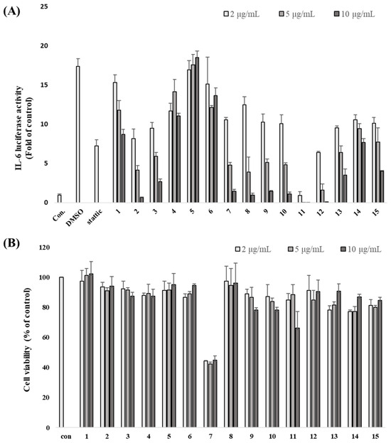 IL-6-induced STAT3 inhibitory effect of L. obtusiloba extract and fractions were evaluated using a luciferase assay in Hep3B cells (A). The viability of Hep3B cells after treatment with L. obtusiloba extract and fractions (B). 1: 50% EtOH extract, 2: hexane fraction, 3: ethyl acetate, 4: butanol, 5: water, 6–15: EA fraction 1–10.