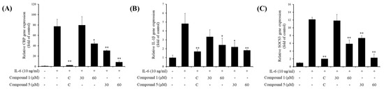 Effects of compounds 1 and 5 on the mRNA expression of IL-6-induced gene expressions in Hep3B cells. (A) CRP; (B) IL-1β; (C) SOCS3. Hep3B cells were pretreated with 1 and 5 at 30 and 60 μM for 1 h and induced with IL-6 (10 ng/mL) for 5 h. The gene expressions were analyzed using real-time PCR. C, 20 μM of cirsiliol. * p < 0.05, ** p < 0.01 compared with the only IL-6-treated group. Values are expressed as the means ± S.D. of three individual experiments. * p < 0.05 and ** p < 0.01 versus the only IL-6-treated control group obtained through one-way ANOVA followed by Dunnett’s test.