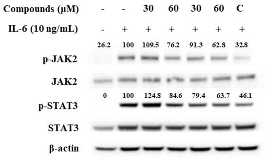 To determine the inhibitory mechanism of pSTAT3-induced gene, pSTAT3 expressions of Hep3B cells were investigated using immunofluorescence staining. The results showed that the compounds downregulated pSTAT3 nuclear translocation and pSTAT3 expression (Figure 4). Furthermore, Western blot analysis of JAK2 and STAT3, which are IL-6 signaling molecules, showed that the compound treatment decreased phosphorylations of JAK2 and STAT3 (Figure 5). These results indicate that the compounds regulate IL-6/STAT3 signaling through JAK2.