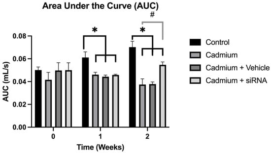 Areas under the curve for the different groups are shown at weeks 0, 1, and 2. Values are expressed as mean ± standard error of the mean (SEM), n = 6 rats. Significant differences: * p < 0.05 vs. control, and # p < 0.05 vs. cadmium. One-way ANOVA was used for the comparisons between the different groups.