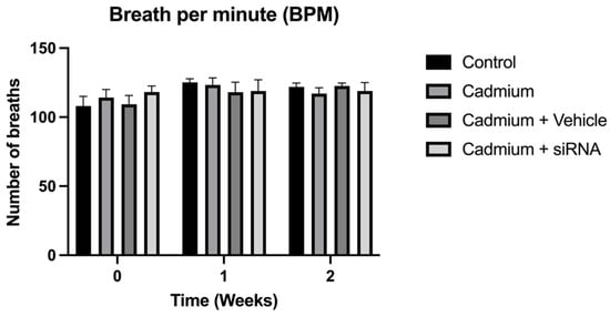 The respiratory mechanics analysis showed that the area under the curve decreased significantly after cadmium chloride administration; however, this was reversed by siRNA administration (Figure 1). On the other hand, no changes are observed in breathing frequency (Figure 2).