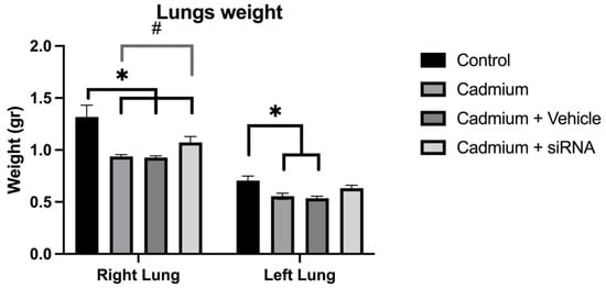 Lung weights for the different groups. Values are expressed as mean ± standard error of the mean (SEM), n = 6 rats. Significant differences: * p < 0.05 vs. control, and # p < 0.05 vs. cadmium. One-way ANOVA was used for the comparisons between the different groups.