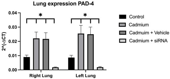 Cadmium chloride administration produced a reduction in lung weight, which was to a lesser extent in the right lung after the administration of siRNA (Figure 3). In addition, a significant increase in PAD4 was observed, which was also reduced after the administration of siRNA (Figure 4).