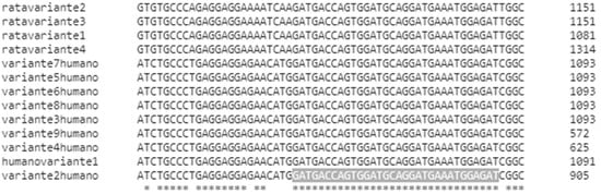 Blast comparison of the different messenger RNA sequences in humans and rats and their various variants. Asterisks indicate regions where the sequences are identical; this area was selected for siRNA design.