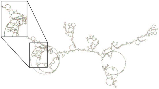 The siRNA design showed that the rat-human transcripts had a 29-nucleotide similarity, which indicates equality in the sequences of both rats and humans. This equality in the region motivated the selection of this area to perform the sequences. (Figure 5). Regions susceptible to silencing were also identified at the gene coordinates NM_012387.3 of NCBI, which encodes human PAD4 for the nucleotides 1118–1147 (Table 5). These regions belong to a region CDS and present loop and stem loop structures in the secondary structure in the different variants of the mRNA from both rats and humans, which suggests susceptibility to silencing by siRNA (Figure 6). We found only three important proteins associated with the generation of off-targets (Table 6 and Table 7).