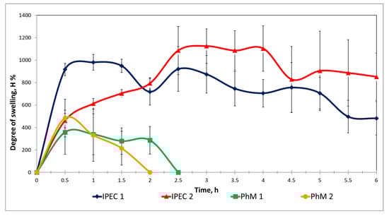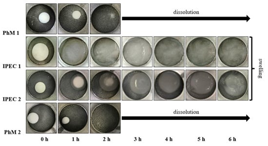 Assessment of the behavior of IPEC matrices without drugs in mimicking biological liquids media is necessary for prediction of the possibility of application of IPEC as carriers for DDS. The behavior of matrices based on IPEC Eudragit® EPO/L100 in comparison with matrices based on PhMs was investigated under the conditions mimicking medium of the fasted stomach (0.1 M HCl). It was noted that matrices based on PhMs dissolved after 2 h in an acidic medium. Matrices based on IPECs retained their shape, increased in size and transformed into a hydrogel structure that withstood the entire 6 h of the experiment (Figure 1). Based on the comparison of swelling profiles (Figure 2), it can be concluded that matrices of IPEC 2 were characterized by slower increase of the degree of swelling in the first hours of exposure to the medium. However, the degree of swelling of the matrix based on IPEC 2 was higher (851.53%) than that of IPEC 1 (481.54%) by the end of the experiment.