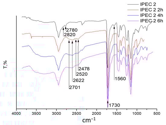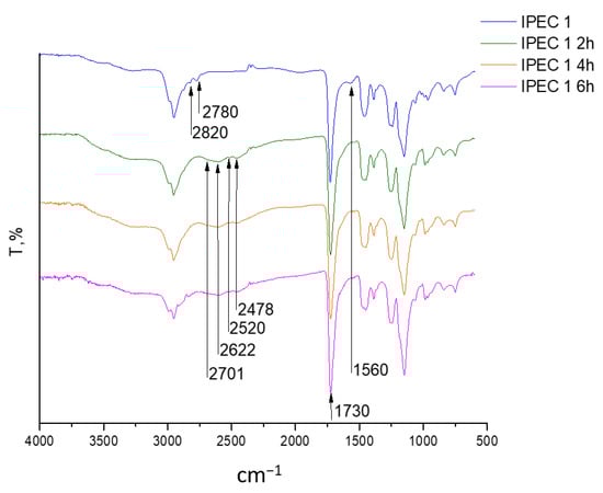 The different behavior of matrices based on PhMs and IPECs is most likely explained by the structure of IPEC stabilized by intermacromolecular ionic bonds between ionized dimethylamino groups of EPO and carboxylate groups of L100. The presence of these bonds has been proven by a new characteristic band at 1560 cm−1 in the FTIR spectrum of IPECs. The FTIR spectra (Figure 3 and Figure 4) of the obtained IPEC 1 and IPEC 2 show that the intensity of the characteristic band at 1560 cm−1 decreased with an increasing residence time of the IPEC matrices in mimicking fasted stomach medium (0.1 M HCl). This fact can explain slight dissolution of matrices, which led to a decrease in the swelling plot.