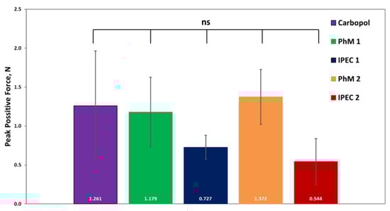 We proved that PhMs and IPECs have high mucoadhesive properties as Carbopol. We repeated the adhesion test using pig stomach tissue. Figure 6 shows peak positive force results on pig stomach mucosa. The adhesion on the mucosa tissue depends on different factors: contact surface, hydration, part of the stomach, etc. Carbopol had a better adhesion on stomach mucosa than IPECs and PhMs. But in case of excessive adhesive properties of gastroretentive systems, they can be adhesive to the throat or esophagus and cause damage [].