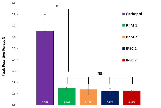 IPEC and PhM adhesion was studied on a TA.XTplus texture analyzer (Stable Micro Systems, Surrey, UK). Mucin compacts and fragments of the pig stomach mucosa were used as substrates for adhesion. Mucin compacts were obtained by pressing on a 15-ton microprocessor-controlled automated hydraulic press for IR spectroscopy (Pike Technologies, Madison, WI, USA) at a pressure of 2.45 MPa using 13 mm die for IR spectroscopy (Pike Technologies, Madison, WI, USA). Pig stomach tissue was received from an abattoir immediately after animal slaughter and transferred in a polystyrene container with dry ice. Stomach tissues were defrosted and excised to 3 × 3 cm sections. Bioadhesive properties on the pig stomach mucosa were studied in the acidic medium (0.1 M HCl). IPEC or PhM compacts were attached to the probe, while mucin compacts or stomach tissue were placed on the platform. Carbopol® 2020 (Carbopol) was used as a reference (positive control). The parameter settings of analysis with mucin compacts were []: pre-test speed (0.5 mm/s), test speed (0.1 mm/sec), post-test speed (0.1 mm/s), applied force (0.1 N), trigger force (0.1 N), return distance (10 mm). The parameter settings of analysis with pig stomach tissue were: pre-test speed (1 mm/s), test speed (0.1 mm/sec), post-test speed (0.1 mm/s), applied force (0.1 N), trigger force (0.1 N), return distance (10 mm). The residence time of each formulation on the mucin compact and pig stomach mucous membrane was 60 s. The data were captured through Texture Exponent Software (Version 3.2). The peak force was used to assess the gastroadhesivity of the matrices. The peak force is the maximum force required to detach the membrane or the tissue from the matrices [].
