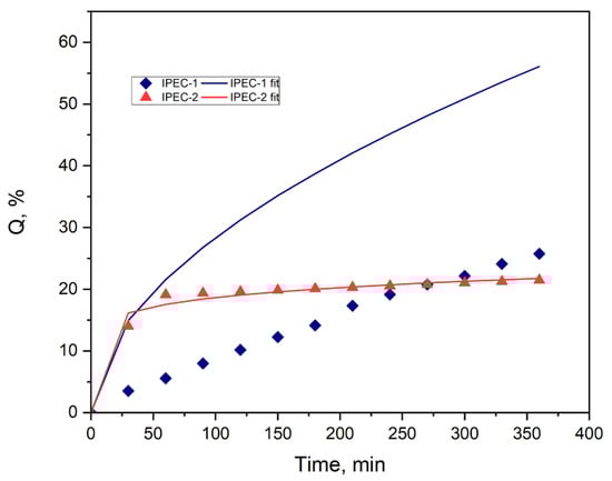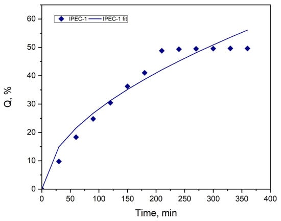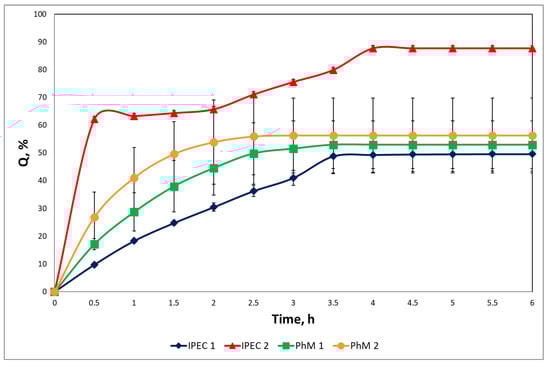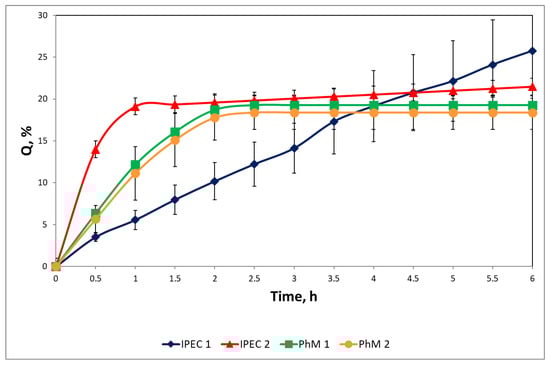 According to the received results (Figure 7), release profiles of MZ had similar characteristics for all samples, with the total amount of released drug more than 49.62 ± 6.20% for matrices based on IPEC 1 and 87.69 ± 5.15% for matrices based on IPEC 2. The amount of released MZ from both PhMs was around 50%. These results are consistent with previously published data regarding theophylline, which has good solubility in biological fluids of the GIT and belongs to the I class of BCS []. The release rate of MZ increased with the increasing degree of swelling. The slightly different shape of the IPEC 2 curve is associated with the disintegration of the matrix that occurred during the experiment.