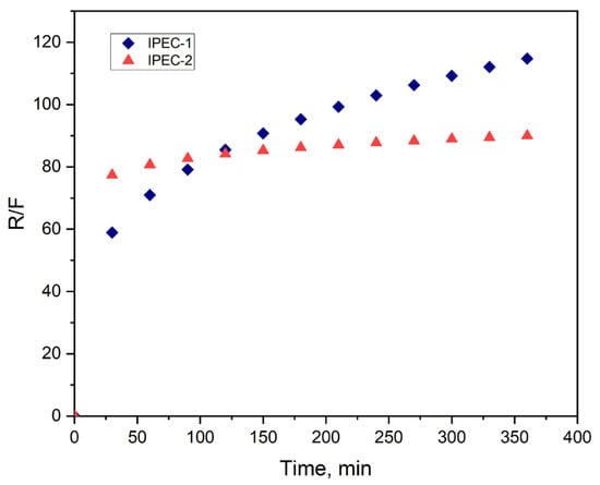 Relaxation contribution/Fickian contribution (R/F) ratio was calculated by using the received parameters (Figure 11 and Figure 12). R/F > 1 for both complexes with MZ and ACR, which showed that the erosion dominates during the process of both drug releases. The drug releases for MZ and ACR are controlled by relaxation of polymeric chains in matrices. That is, increasing R/F ratio values for release MZ in ACR from IPEC 1 matrices with time indicates the increasing relaxational contribution [].