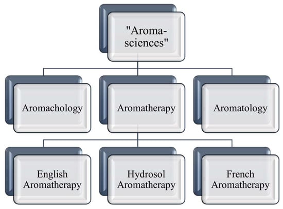 Aromatherapy is the art and clinical science utilizing naturally extracted lipophilic essential and vegetal oils, including hydrophilic herbal essences, in medical curative processes while promoting mental–physical wellness [16,17]. The term was created by Dr. René Maurice Gattefossé, in 1937 [18,19], and originates from Ancient Greek—“ἄρωμα” (scent, fragranced oil or plant, and spices) and “θεραπεία” (service and medical treatment). The essential products characteristic of aromatherapy include essential oils; their scientific pharmaceutical Latin name appears as aetheroleum, which has Greek roots (“αἰθήρ”—heaven, upper purer air, and/or ether). Essential oils are mostly pleasant-scented complex mixtures of mono- and sesquiterpenes and phenylpropane derivatives. According to some surveys, aromatherapy is the second most popular complementary medical practice in the U.K. [20] and has become a worldwide, fast-growing holistic treatment practice.