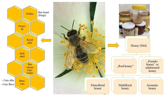 Honey (mel in Latin) is a supersaturated aqueous, slightly acidic (pH 3.2 to 4.5) solution with high nutritional value collected and processed by various Apis spp. through repeated digestion and regurgitation of the nectar of plants. The chemical structure of this pure and functional food is dependent upon geographical and botanical diversity, containing 70–80% carbohydrates (glucose and fructose), a-tocopherol, ascorbic acid, phenolics, amino acids, minerals, vitamins, trace elements, and enzymes such as glucose oxidase, catalase, and peroxidase [50,51]. Honey can be classified into four clusters based on its origin: Pure, monofloral honey is derived from a single herb and has a higher market value when compared with multifloral honey, which contains more bioactive compounds from a variety of herbs. Aromatic honey is a natural and not-human-made product using essential oils or herbal parts to add bioactive components into the base honey. Adulterated honey (or “pseudo-honey”) is a totally or partially human-made product using fructose or other plant-based carbohydrates [52,53,54] (Figure 2).