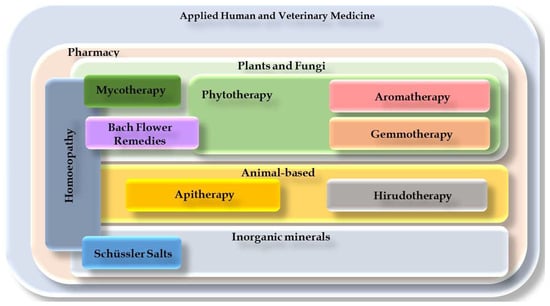 In consideration of the bibliographic resources, a thorough search was implemented in the most frequently applied online scientific databases, including PubMed.org, ScienceDirect.com, and Researchgate.net, using the following keywords: “Phytotherapy”, “Aromatherapy”, “Aromachology”, “Aromatology”, “Hydrosols”, “Apitherapy”, “Mycotherapy”, “Gemmotherapy”, “Hirudotherapy”, “Schüssler salts”, “Bach Flower Therapy”, “definition”, “classification”, “limitation”, “chart”, and various combinations.