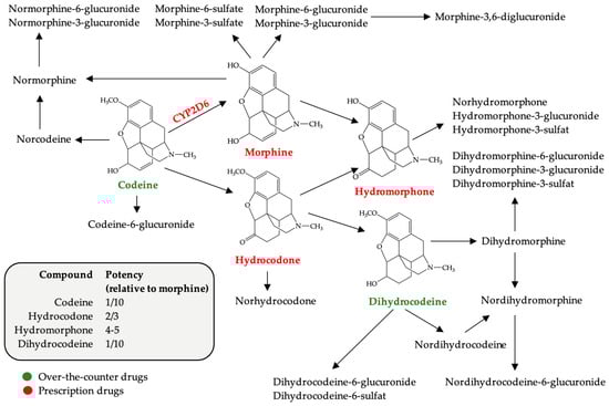 - Dean, L.; Kane, M. Codeine Therapy and CYP2D6 Genotype. In Medical Genetics Summaries; Pratt, V.M., Scott, S.A., Pirmohamed, M., Esquivel, B., Kattman, B.L., Malheiro, A.J., Eds.; National Center for Biotechnology Information (US): Bethesda, MD, USA, 2012. [Google Scholar]
