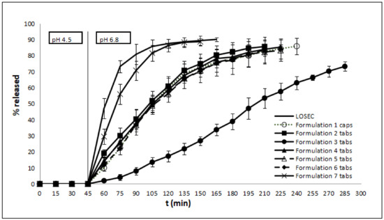 In order to compare the dissolution profiles of the formulations and Losec®, the respective graphs of % omeprazole release vs. time were constructed. The values of t20%, t50%, and t90% were also calculated for each product, with tx% corresponding to the time that x% of the active substance is released from the pharmaceutical formulation.