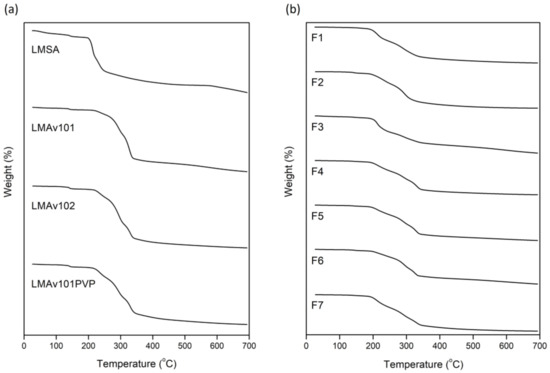 From TGA studies (Figure 3), all the excipients showed an initial decomposition step starting approximately at 139 °C, which corresponds to the loss of the water molecules present in the excipients’ mixtures, followed by the main decomposition step starting at 199 °C for LMSA and approximately at 219 °C for the rest of the excipients’ mixtures. For the LMSA, this decomposition ends at 249 °C. The presence of Avicel® PH-101 or Avicel® PH-102 leads to the decomposition ending at 338 °C and 339 °C, respectively. On the other hand, the presence of PVP leads to the decomposition ending at 343 °C. This decomposition step corresponds to the loss of the water molecules that are present in the mixtures of excipients. The main difference between Avicel® PH-101 and Avicel® PH-102, which are both microcrystalline celluloses, is the degree of agglomeration of the particles, which is higher in 102 [29]. For this reason, we did not observe any significant differences at the endpoint of the decomposition process.