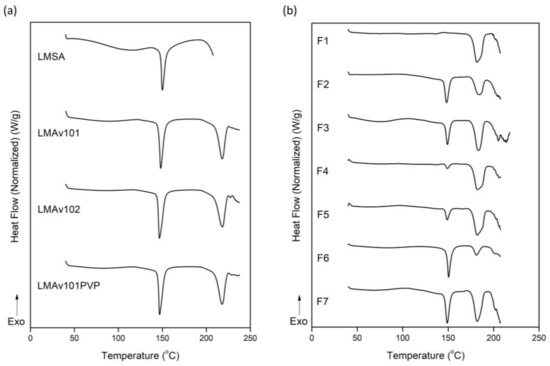 DSC curves of (a) excipients and (b) formulations of OME (LMSA: lactose monohydrate/sodium alginate; LMAv101: lactose monohydrate/Avicel 101; LMAv102: lactose monohydrate/Avicel 102; LMAv101PVP: granules).